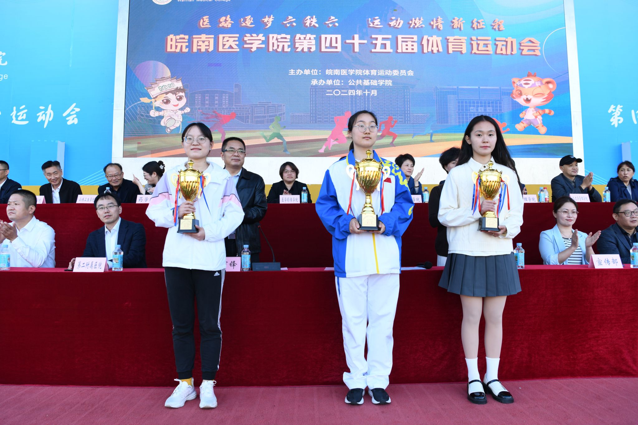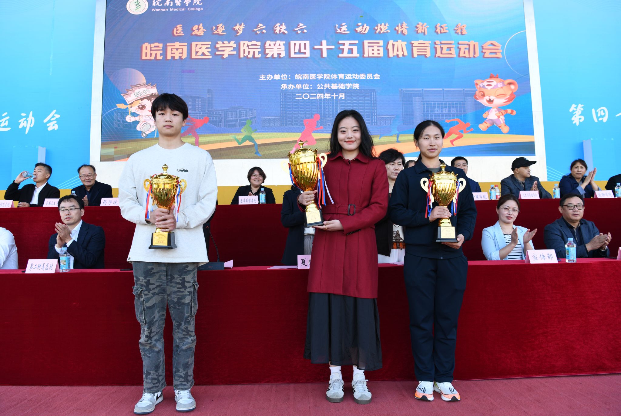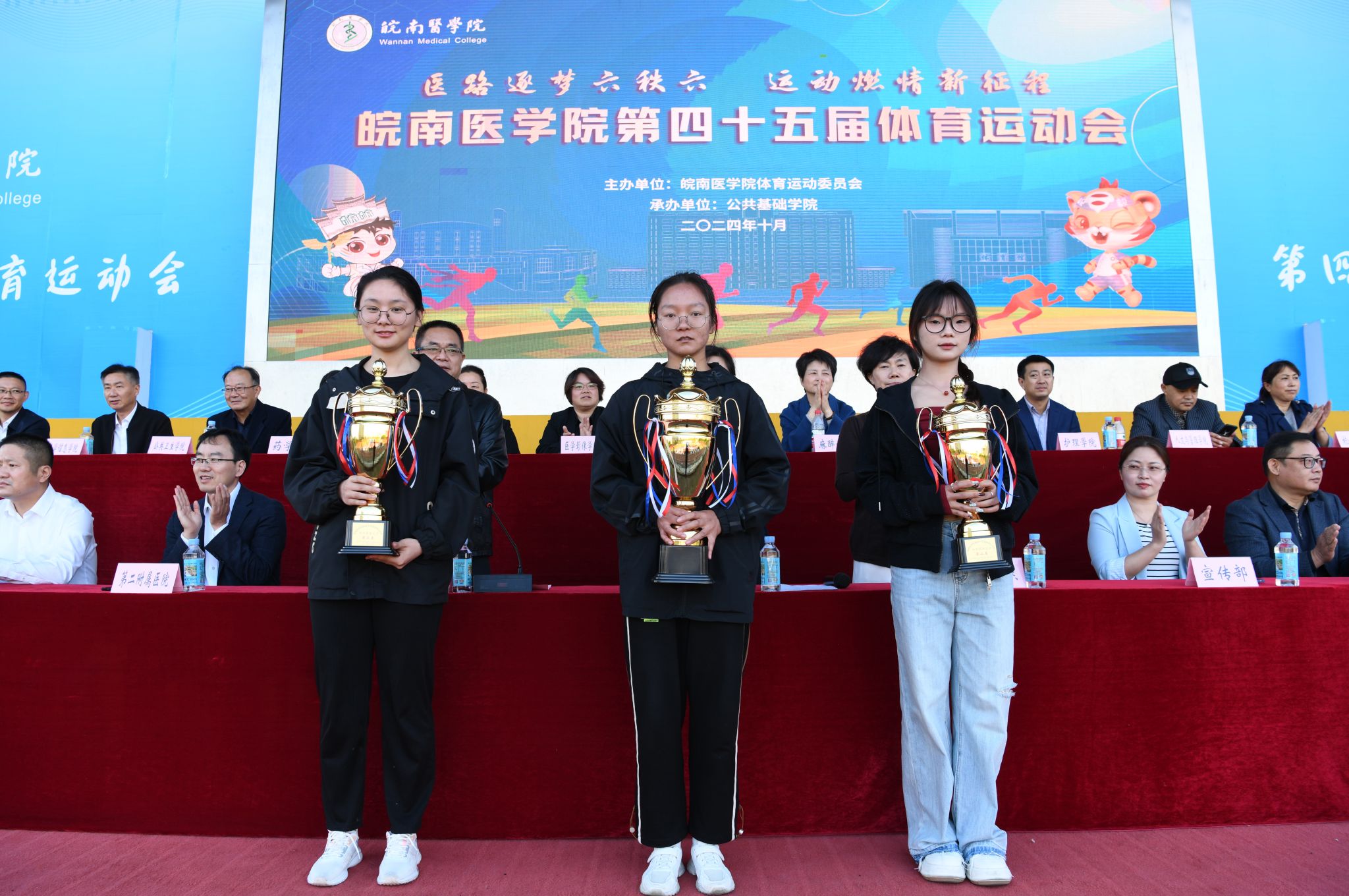 第45届体育运动会总裁判长周广仁宣布了本届运动会比赛成绩。田径、趣味项目女子团体前三名分别为临床医学院、医学影像学院、药学院,田径、趣味项目男子团队前三名分别为医学影像学院、麻醉学院、药学院,田径、趣味项目男女团体前三名分别为医学影像学院、临床医学院、药学院;年度女子团体总分前三名分别为临床医学院、医学影像学院、药学院,年度男子团体总分前三名分别为医学影像学院、麻醉学院、药学院,年度男女团体总分前三名分别为医学影像学院、临床医学院、药学院;“最佳组织奖”获奖单位为临床医学院、麻醉学院、医学影像学院、药学院;“体育道德风尚奖”获奖单位为法医学院、口腔医学院、护理学院、人文与管理学院、公共卫生学院、检验学院、医学信息学院、研究生学院、基础医学院、国际学生组。在欢快的旋律中,校领导分别为获奖集体颁奖。