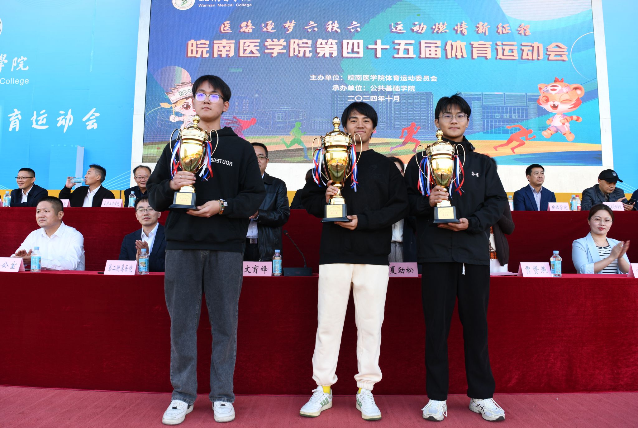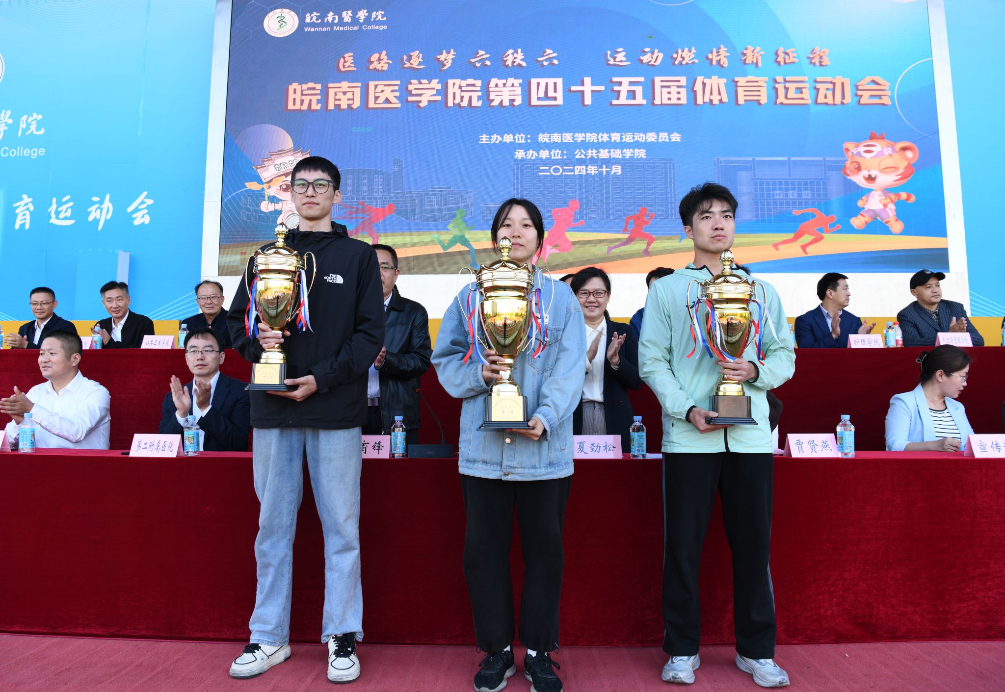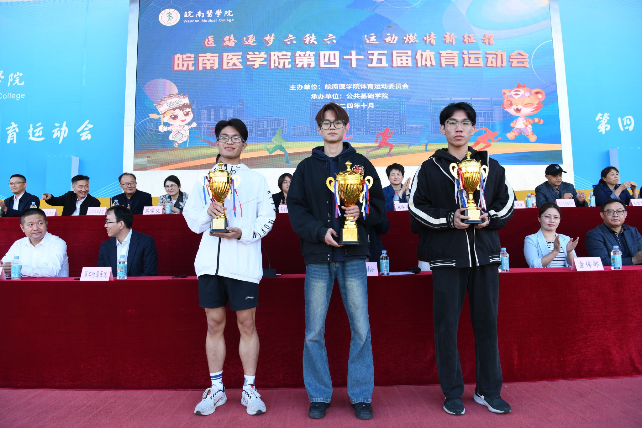 第45届体育运动会总裁判长周广仁宣布了本届运动会比赛成绩。田径、趣味项目女子团体前三名分别为临床医学院、医学影像学院、药学院,田径、趣味项目男子团队前三名分别为医学影像学院、麻醉学院、药学院,田径、趣味项目男女团体前三名分别为医学影像学院、临床医学院、药学院;年度女子团体总分前三名分别为临床医学院、医学影像学院、药学院,年度男子团体总分前三名分别为医学影像学院、麻醉学院、药学院,年度男女团体总分前三名分别为医学影像学院、临床医学院、药学院;“最佳组织奖”获奖单位为临床医学院、麻醉学院、医学影像学院、药学院;“体育道德风尚奖”获奖单位为法医学院、口腔医学院、护理学院、人文与管理学院、公共卫生学院、检验学院、医学信息学院、研究生学院、基础医学院、国际学生组。在欢快的旋律中,校领导分别为获奖集体颁奖。