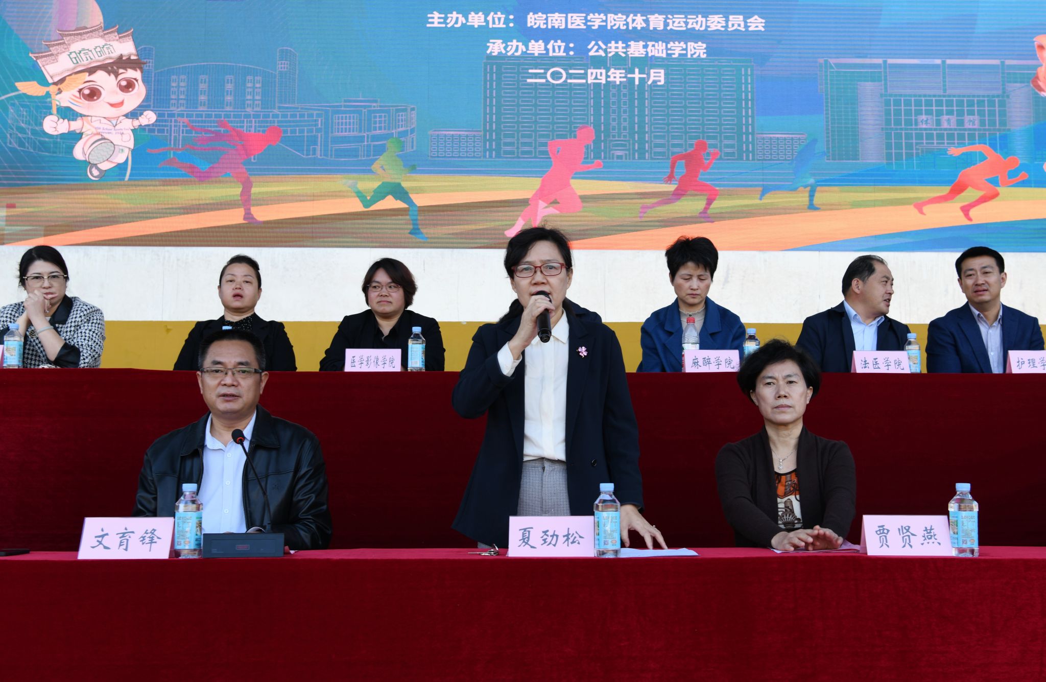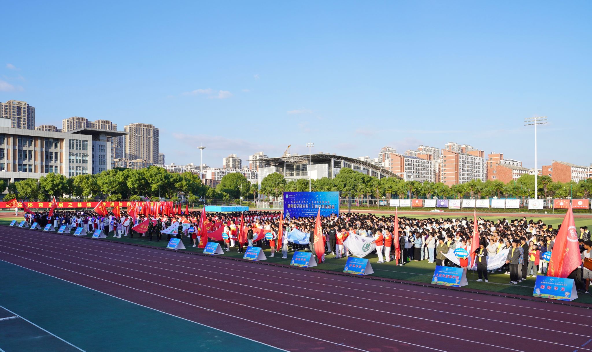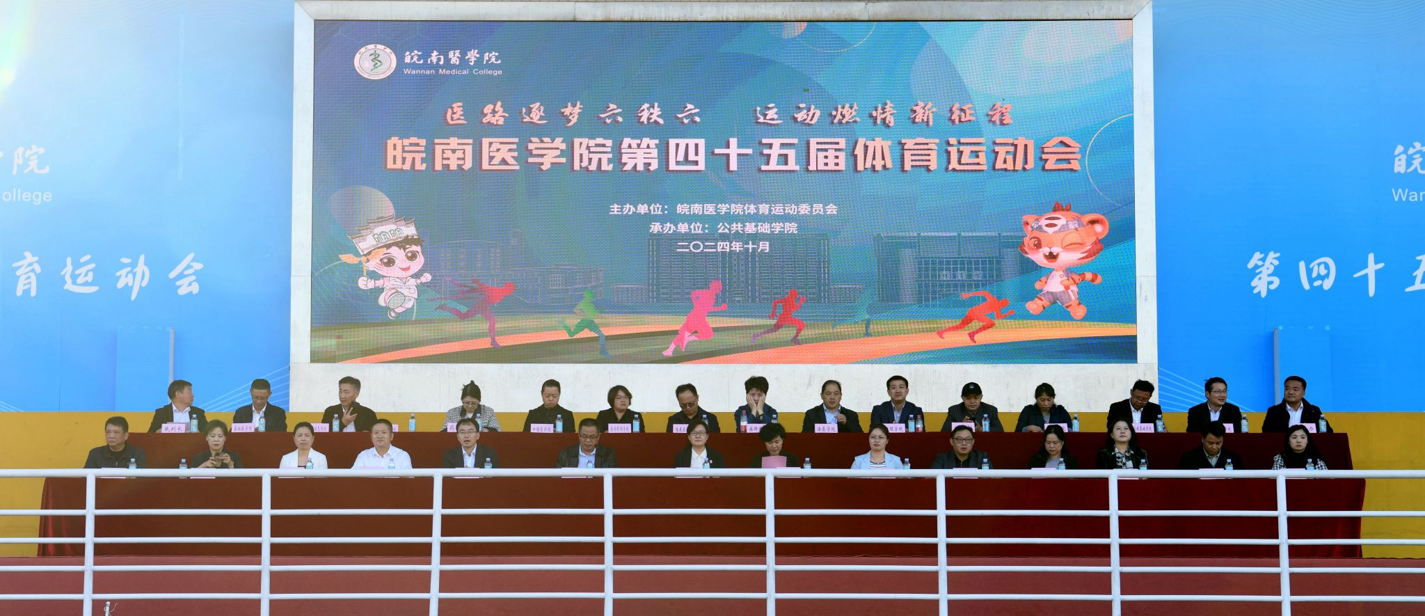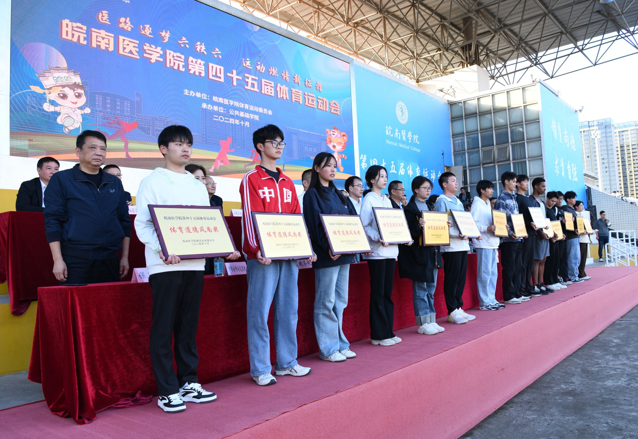 在全校师生医护员工的热情参与和共同努力下,我校第45届体育运动会圆满完成各项预定赛程,于10月20日下午胜利闭幕。闭幕式在田径运动场举行,在校校领导夏劲松、贾贤燕、文育锋,相关职能部门、各学院主要负责人在主席台就座。全体裁判员、教职医护员工代表和各学院学生代表参加闭幕式,党委常委、副院长文育锋主持闭幕式。