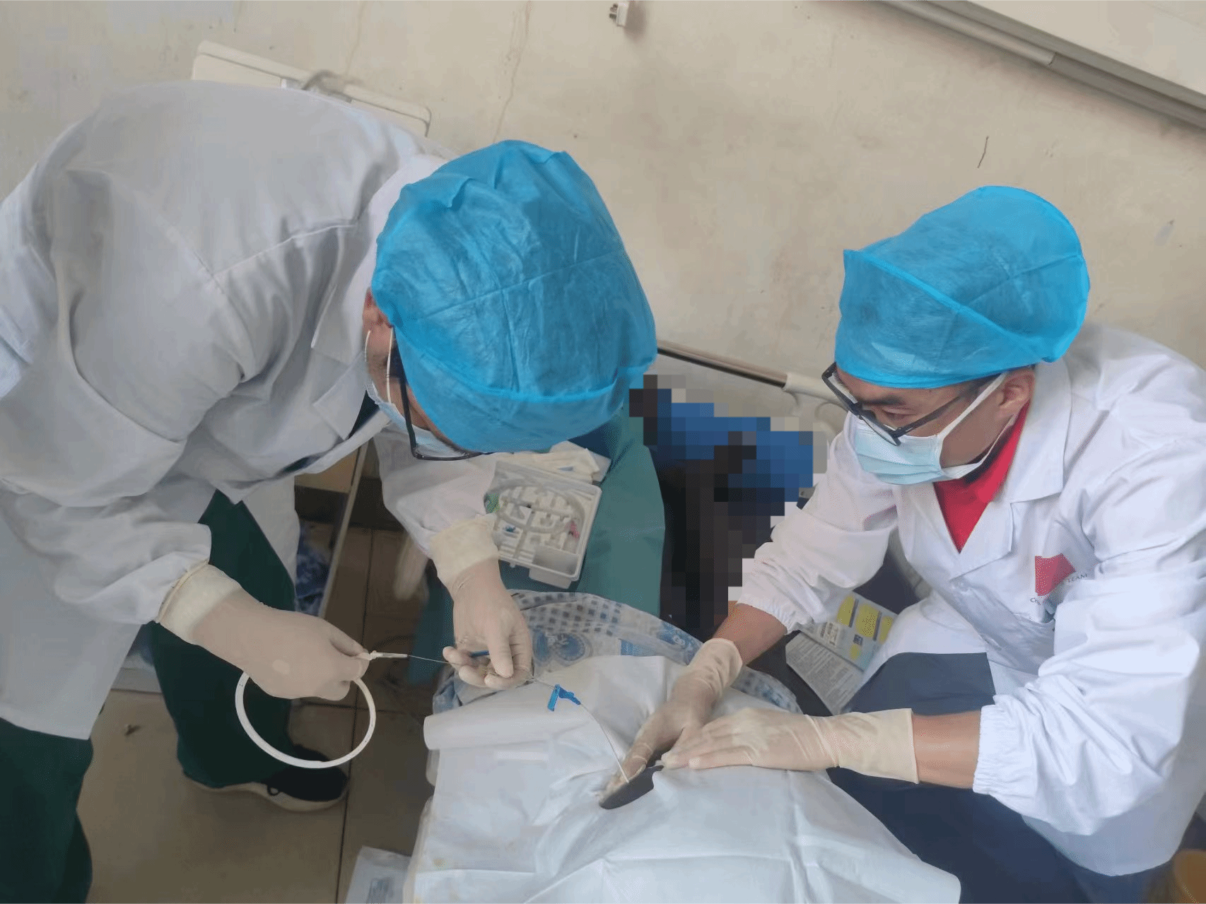 11月15日上午,梁策对患者腹腔穿刺的最佳穿刺点进行了精准定位。王文节依据腹腔穿刺术操作规范依次进行了穿刺点皮肤消毒、局部麻醉、穿刺等流程。考虑到患者有大量腹水,腹腔内压力较大,穿刺后可能有腹水渗漏及引流管脱落等风险,医疗队队员、我校第一附属医院耳鼻喉科副主任医师王传喜对穿刺点进行了细致的皮肤缝合和腹腔引流管的固定,整个操作时间约25分钟。
