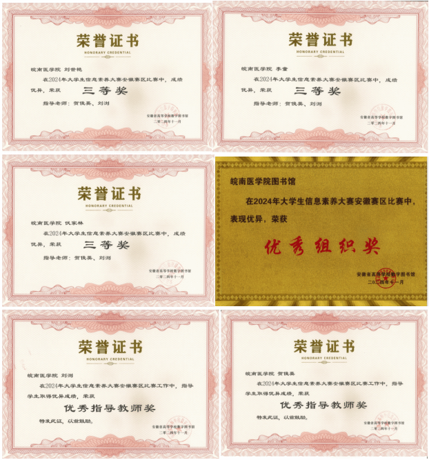近日,由大学生信息素养大赛组委会主办,安徽省高等学校数字图书馆、中国科学技术大学图书馆承办的大学生信息素养大赛安徽赛区比赛圆满落幕。经过激烈角逐,我校由3名同学组成的本科3队获安徽赛区三等奖,2位馆员获评优秀指导教师奖,学校图书馆获优秀组织奖。