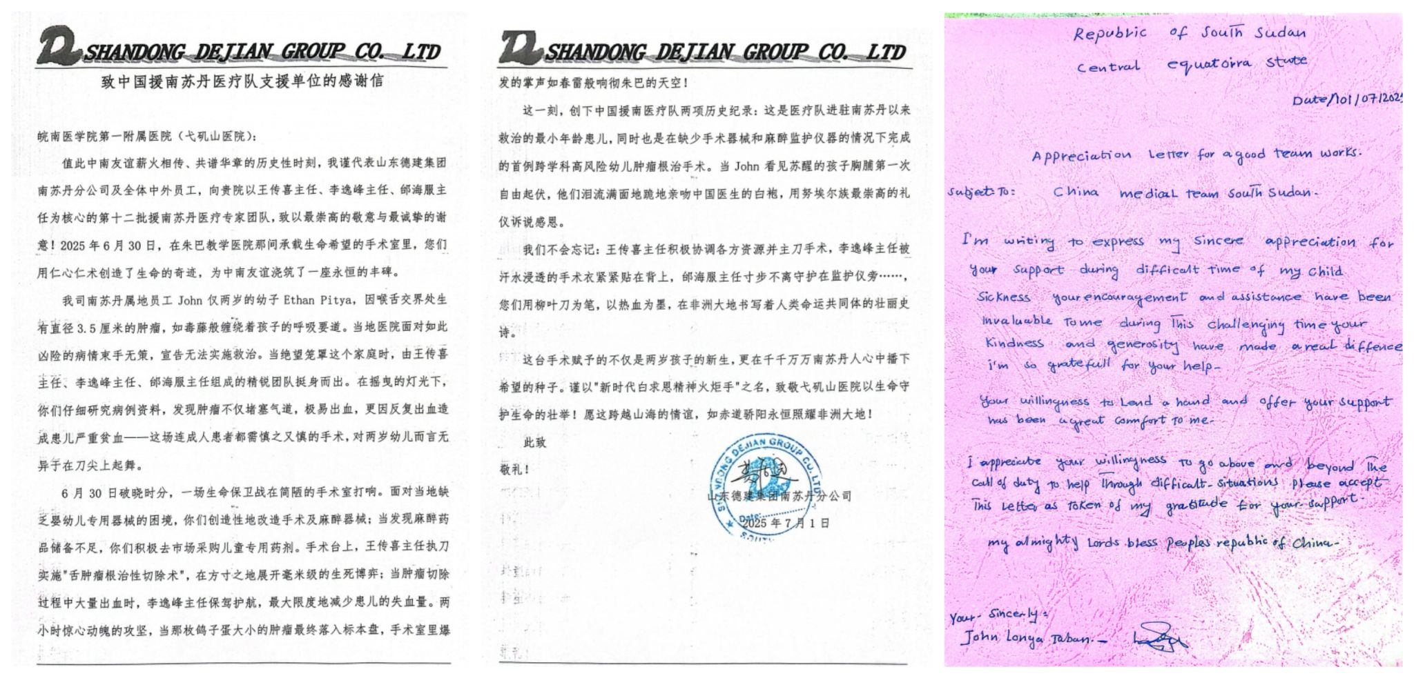 该手术的成功开展也实现了“两个突破”,是中国援南苏丹医疗队手术救治的最小年龄患儿,也是医疗队开展的首例跨学科高风险幼儿肿瘤根治手术。自2024年9月份抵达南苏丹以来,我校第一附属医院援南苏丹医疗队队员继承和发扬中国援外医疗队的优良传统,认真做好医疗救治、疾病防控、教学培训等工作,热忱服务当地患者,为南苏丹医疗卫生事业作出了积极贡献。(王传喜/文、图)