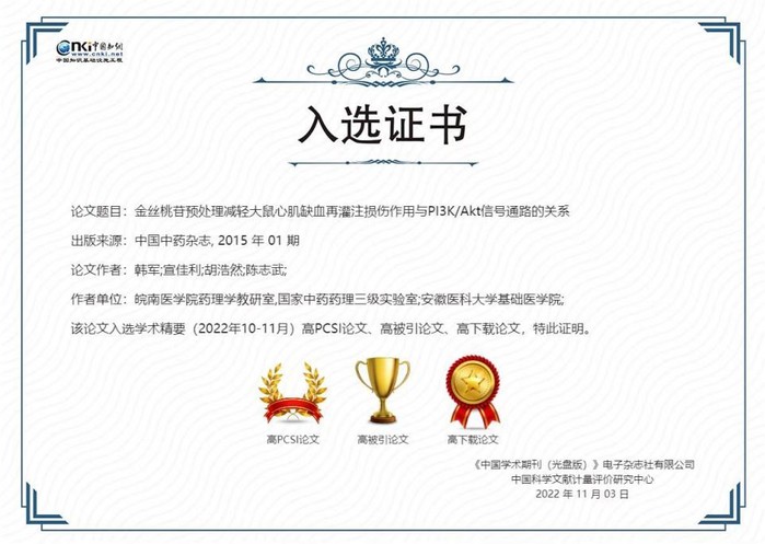 韩军教授以第一作者发表的论文《金丝桃苷预处理减轻大鼠心肌缺血再灌注损伤作用与PI3K/Akt信号通路的关系》文献总被引频次为 90,其中被核心期刊引用频次为 37,PCSI指数为 24.640,文献总被引频次在“中药学”领域排名前1%(37/25286);文献总下载频次为3310,PDSI指数为19.852,在“中药学”领域排名前0.1% (14/25286)。文章的入选对提升我校国内外学术影响力产生了积极的推动作用。