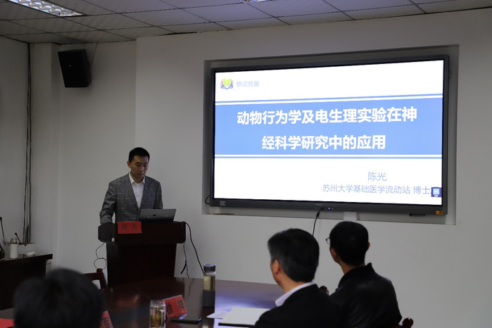 陈光作了题目为“动物行为学及电生理实验在神经科学研究中的应用”的报告,他系统阐述了动物行为学实验中的一些基本概念和实验设计,重点结合其博士及博士后期间研究内容,阐述动物行为学及电生理实验在神经科学中的实践应用。报告结束后,与会人员和陈光博士后进行了深入交流。朱再满和万磊对陈光博士后的到来表示欢迎,并分别介绍了我校科研工作的相关进展和科研平台建设情况,以及我校关于人才引进的相关政策情况。马同军表示希望并欢迎陈光博士加入我校进行工作,并对本次学术报告进行总结。